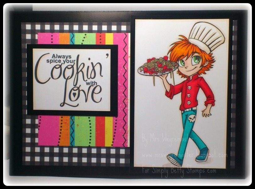 Miller is coloured with Letraset Promarkers and matted onto black glossy card stock. Like the rest of the Kitchen Fun Cards i've shared with you this week, the papers are from Judikinz. I kept the rest of this card very simple, as i figured with all that pattern anymore embellishments could get a little lost; so all i added was some tiny alphabet stickers for my sentiment.
