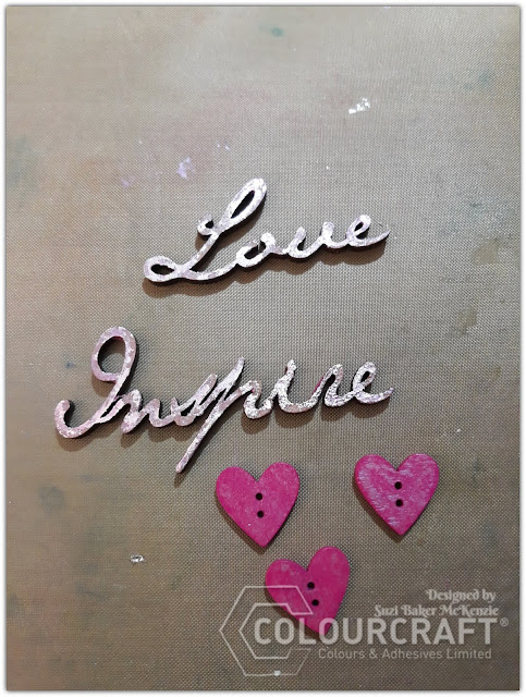 It was then time for me to decide on a sentiment for my canvas. I found a couple of mdf words in the stash, I added Silver foil to them with the Fabric Master Tool followed by some Pink Metallic Paint. I wiped away a little of the paint to enable the shine to come through from the foil. I also used this technique to add some Pink Metallic Paint to some Bright Pink Wooden Heart Buttons I had found in my stash.